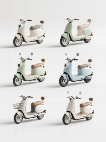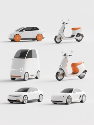 一套6个交通工具3D图标,包含电动车在内,保持简约现代的Q版3D风格,圆润流畅的造型,光滑的塑料质感,鲜艳明快的纯色配色方案,每个交通工具独立置于纯色背景上,整体规整排列成两行三列,无任何文字、logo和水印。