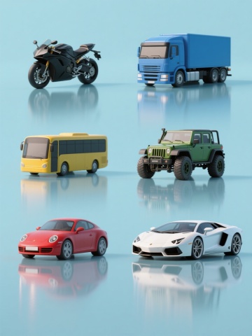 6个不同机动车的3D渲染集合,包含黑色摩托车、红色小汽车、蓝色大货车、黄色公交车、绿色越野车、白色跑车,每个车辆保持光滑的工业设计感和精准的机械细节,均采用纯色背景(每个车辆对应不同主色调),物体下方有清晰的倒影效果,光线来自左上方形成柔和高光和阴影,整体呈现出高度写实的3D建模风格,画面规整排布成两行三列,保持一致的视角和专业产品渲染的视觉质感。