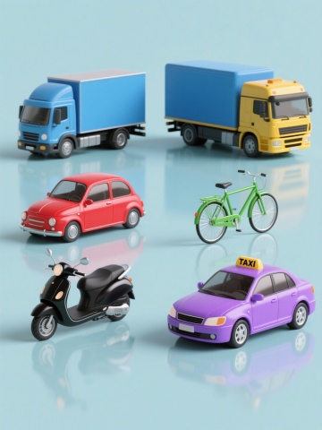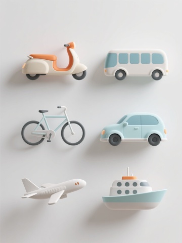 3D卡通风格,六个不同配色、不同材质、不同样式的交通工具元素,排列整齐,白色背景,圆润可爱的造型,鲜艳明亮的色彩,光滑的塑料质感,部分带有透明光泽,每个交通工具都有独特的设计细节,整体呈现出活泼欢快的氛围,具有儿童玩具般的萌系感,光影柔和,边缘清晰,无阴影,简洁干净的视觉效果。