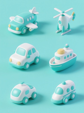 一系列6个不同交通工具玩具的规整排布集合,保持圆润可爱的3D卡通风格,每个元素均采用纯色背景,整体色彩变换为清新明亮的蓝绿色调,包含飞机、汽车、轮船、火车、火箭、直升机,每个交通工具都具有光滑的表面质感、简化的形态结构、白色主体搭配蓝绿色细节,统一的光影处理,柔和的高光和轻微的阴影,元素间等距排列,形成整齐有序的视觉效果,充满童趣和现代设计感。