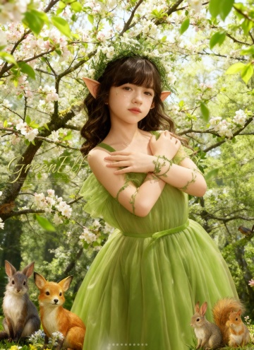 女生变成了精灵,白金色头发,精灵耳朵,有一双巨大的金绿色的翅膀,身上有精美独特的发饰,绿野仙境,童话世界里,到处都是小精灵。高清人像摄影,虚实结合,画面氛围渲染
