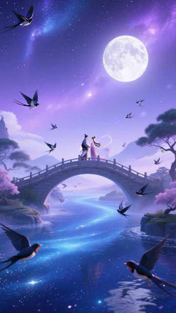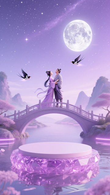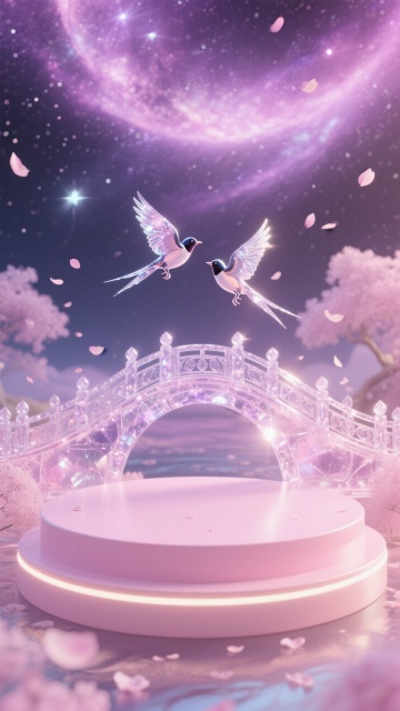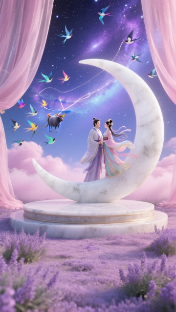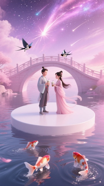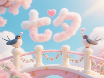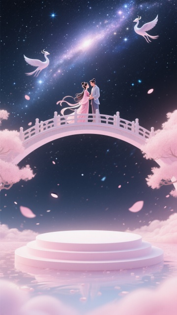 韩式3D风格,画面中央是一座粉红色的曲线木桥,桥上立着一对男女(男子的发型为褐黑色渐变的hedgehog)头,尖尖上翘的头发,柔和的轮廓,穿着浅粉色短袖的衬衫,白色短裤,穿着蓝黑色拼色的人字拖,梦幻的女人眼睛,明亮的银河系,光影交织,白色头发(皮肤细腻光滑:1.1),修长的大腿,周围是粉红色的花瓣),亲密的姿势。仿佛在轻声细语。背景是广阔的天空,底部堆积着大量蓬松的粉红色和紫色云朵,营造出云层氛围;中层云层自然形成一个巨大的心形轮廓,内部散发出柔和的光晕,心脏内外漂浮着许多淡粉色的心形斑点。头顶的天空逐渐变蓝(从浅蓝色过渡到深蓝色),点缀着零星的闪烁星星,两边飞过几只鸟(翅膀展开,羽毛逐渐紫蓝色)。整体色彩柔和,以粉色、紫色和蓝色为主色调。昏暗的光影突显了七夕浪漫而治愈的爱情氛围。对称构图,强调人物的核心视觉元素和心形云桥。,