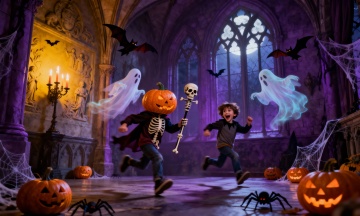哥特风格城堡矗立雪峰之巅,月光与南瓜灯交织出梦幻神秘氛围,圣诞帽点缀万圣元素,3D重拟物风呈现油画质感,光影流动间诉说冬夜童话。
