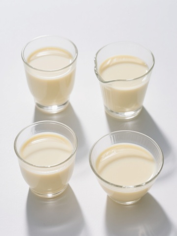 简约现代风格,四个不同造型的豆浆杯规整排布,每个杯子具有独特的设计细节,透明玻璃材质,内盛淡黄色豆浆,表面光滑有细腻光泽,柔和的光影效果,高光与阴影过渡自然,纯纯色背景,无文字,无logo,无水印,整体构图平衡对称,视觉清晰简洁。