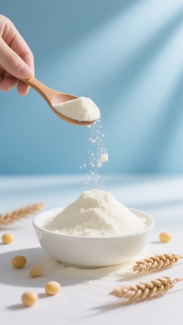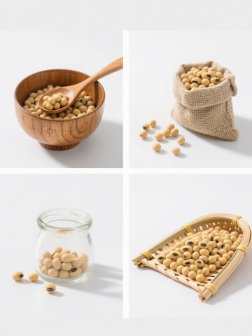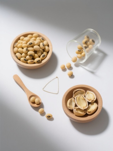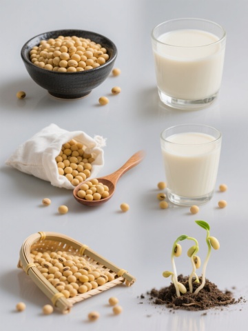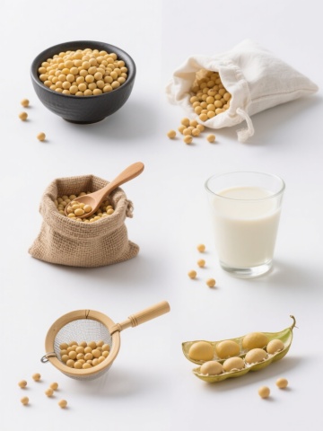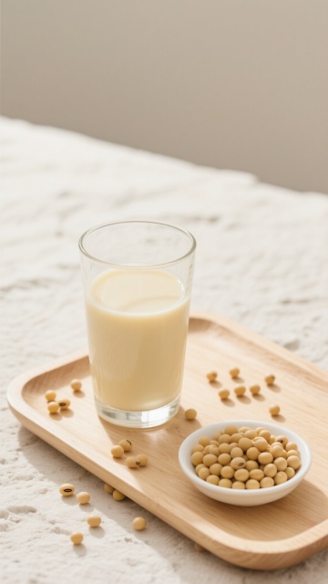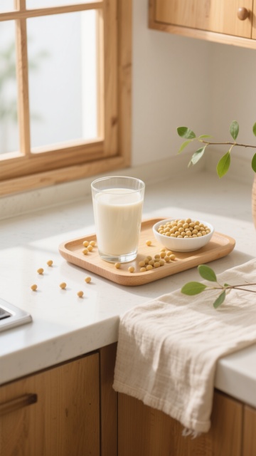 清晨阳光透过木质窗户洒进温馨的厨房,柔和的自然光均匀照亮整个场景,浅米色的石质台面上,一只素雅的白色陶瓷碗中盛着乳白色的豆浆,一把质朴的木勺正将浓稠顺滑的豆浆缓缓倒入碗中,形成优美的弧线,碗的周围散落着几颗饱满的黄色黄豆,背景中可见木质橱柜和悬挂的白色棉质厨房布,整体色调温暖明快,充满自然清新的生活气息,光线柔和细腻,阴影过渡自然,画面质感真实细腻,营造出舒适、健康、温馨的早餐氛围。