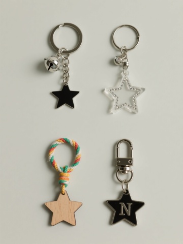 纯白纯色背景,极简主义风格,四个完全不同造型的金属挂钩系列素材集合,规整水平排布。第一个挂钩挂着银色汽车钥匙和黑色遥控器,第二个挂钩挂着金色边框黑色镜片太阳镜,第三个挂钩挂着银色钥匙串和米色编织绳钥匙扣,第四个挂钩挂着粉色编织绳和白色毛球流苏挂饰。高清晰度产品摄影,清晰的金属质感,柔和均匀的光源,无阴影,物体边缘锐利,色彩真实自然,简约现代设计感。