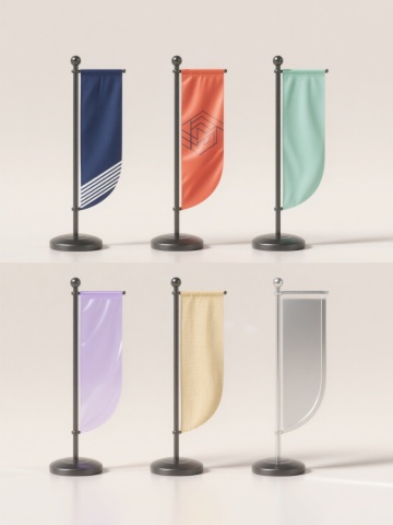 3D渲染风格的道旗设计展示图,浅色背景,上下两行对齐排列共六个道旗造型,每个道旗拥有独特的配色方案、样式设计和材质表现。道旗主体为垂直长方形旗帜,搭配金属质感黑色旗杆和圆形底座,旗杆顶部有小圆球装饰。第一行从左到右分别为:深蓝色哑光布料道旗,旗帜边缘有白色细条纹装饰;橙红色高光缎面道旗,旗帜中央有简约几何图案;浅绿色磨砂塑料质感道旗,四角有圆角处理。第二行从左到右分别为:淡紫色透明亚克力材质道旗,带有细微磨砂纹理;米黄色亚麻布道旗,表面有自然布纹肌理;浅灰色反光金属质感道旗,边缘有抛光处理。整体设计简洁现代,光影柔和,物体边缘清晰,具有产品展示图的专业感和真实质感,无任何文字、LOGO、二维码及电话地址等元素。