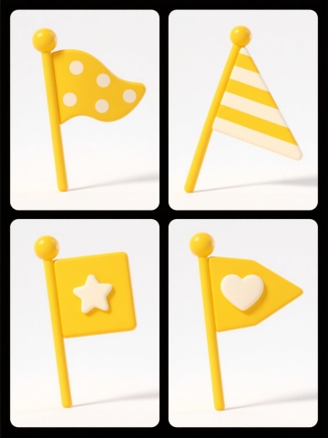 一组四个造型完全不同的卡通风格小旗子,均保持统一的橙红色渐变旗面和米白色旗杆,具有圆润的3D立体造型和光滑细腻的质感,每个旗子展现独特的飘扬动态,有的旗面呈大弧度波浪卷曲,有的边缘轻微上扬,有的中间向内凹陷,有的则是柔和的S形摆动,所有旗子在纯色背景上以规整的网格状排布,保持一致的明亮光影效果和简洁明快的设计风格。