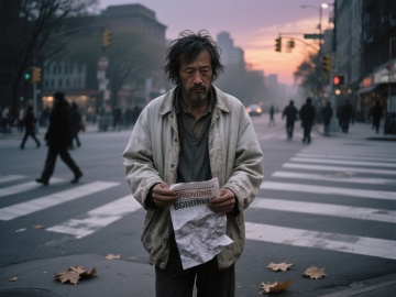 福尔摩斯侧身站立,嘴里叼着烟斗,头戴猎鹿帽,身穿经典的深色长风衣,背景是伦敦雾蒙蒙的街道,整体氛围神秘而睿智