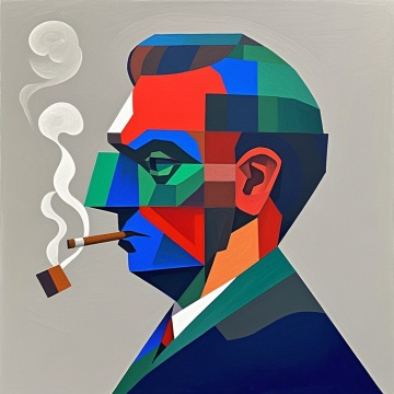 画面中心是一轮巨大的发光的月亮,弯弯的月亮,不是满月,月亮的下沿上坐着一个英国绅士,他的大小只有月亮的五分之一,向左上方望去,他头发凌乱,身穿邋遢的衬衫,手里握着一只油画画笔,深蓝色背景,灵感来自于名著《月亮与六便士》