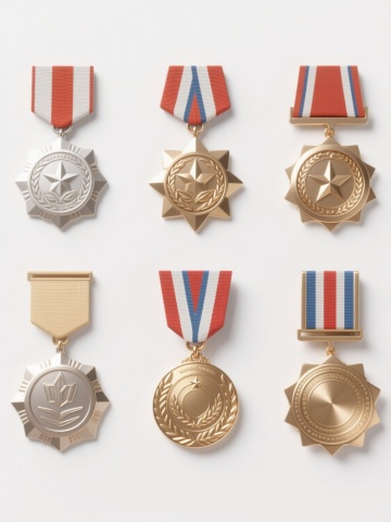 六个不同样式、不同材质的勋章,白色背景,排列整齐,3D渲染,超写实质感,金属光泽,高光与阴影对比强烈,细节精致,立体感强,奖章边缘锐利,中心图案清晰,绶带垂坠自然,整体视觉层次分明,专业设计感,高品质CG渲染效果