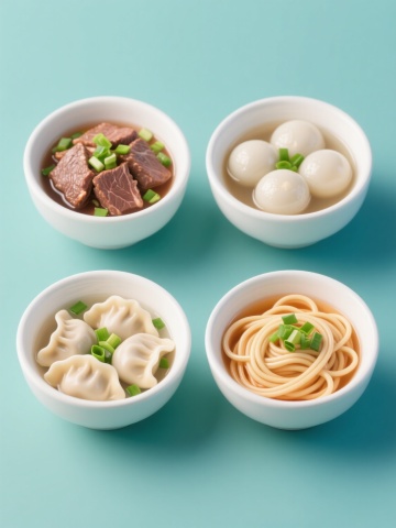 白色纯色背景上,四个规整排布的美食菜品,保持超写实摄影风格,高分辨率,清晰的细节,温暖的光线,柔和的阴影,每个菜品都盛放在白色瓷盘中,具有光泽感的酱汁,鲜艳的色彩,第一个是红烧肉,色泽红亮,撒有绿色葱花,第二个是酱烧排骨,肉质鲜嫩,酱汁浓郁,第三个是红烧鱼块,鱼肉细腻,汤汁鲜美,第四个是红烧狮子头,圆润饱满,肉质紧实,整体构图平衡,视觉层次分明,突出菜品的质感和美味。