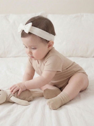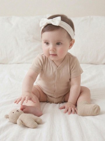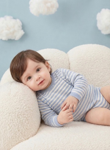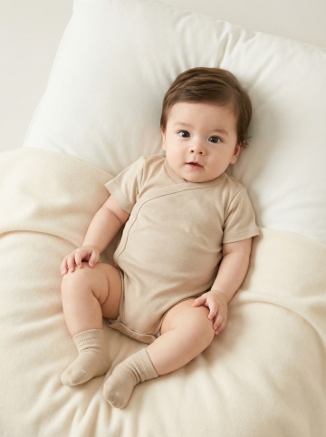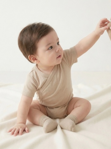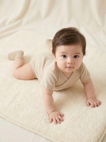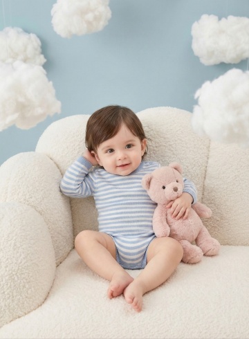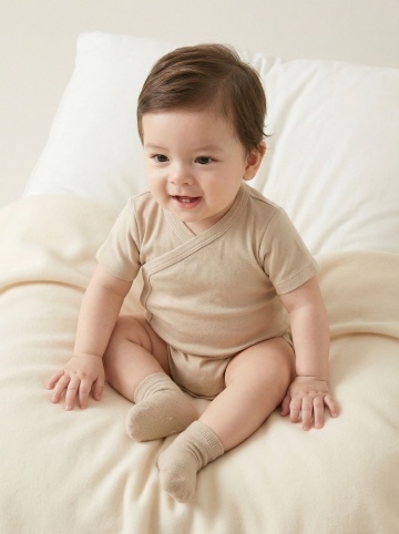 明亮柔和的室内自然光下,一位亚洲婴儿坐在浅色木地板上的白色柔软地垫上,穿着米白色针织连体衣,双手开心地向上举起,脸上洋溢着灿烂的笑容,背景中挂着蓝灰色系的三角旗装饰,整体画面温馨治愈,色调温暖柔和,光线均匀自然,婴儿的皮肤质感细腻,服饰纹理清晰,构图居中,展现出婴儿活泼可爱的瞬间。