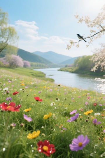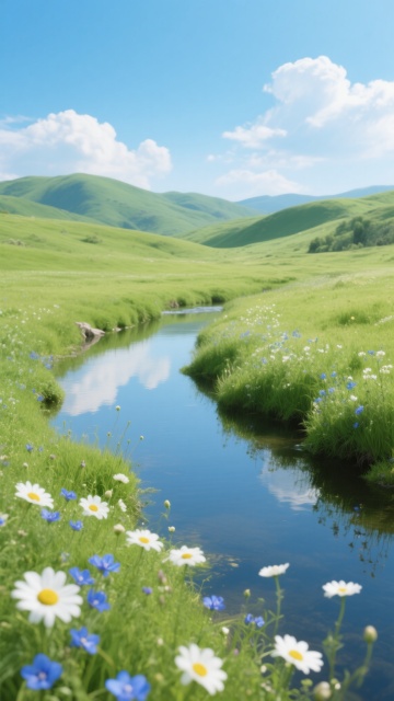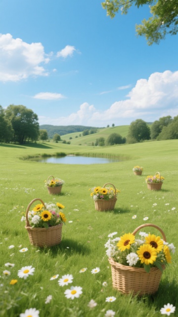 阳光明媚的户外场景,一片生机盎然的绿色草地,草地上点缀着白色的小花,远处是茂密的树林,天空湛蓝,飘着几朵白云,光影效果自然,呈现出不同的户外自然景观风格,可能是森林边缘的开阔草地,也可能是山间的平缓草甸,整体氛围清新自然,充满活力。