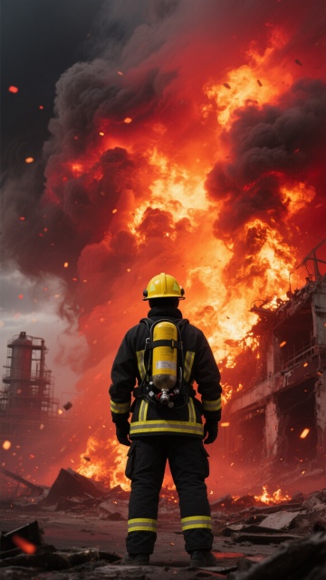 扁平风格插画,两名身着红色消防服、黄色头盔和背带的消防员正合力紧握消防水带前端,面向熊熊燃烧的巨大橙色火焰,背景中隐约可见城市建筑轮廓和其他消防员的剪影,整体色调以炽热的红橙黄为主,搭配深邃的紫色天空,线条简洁流畅,色块分明,呈现出消防员英勇无畏冲向火场的紧张而充满力量的救援场景。