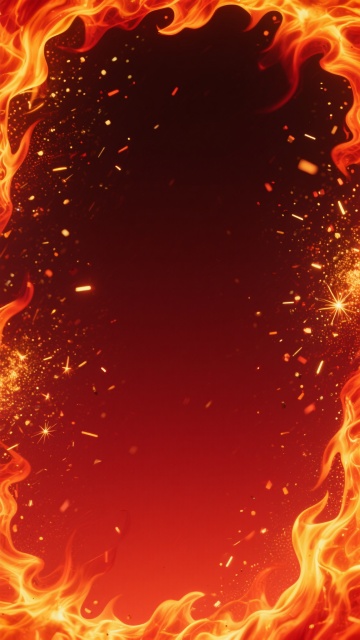 暗红色渐变背景,底部和顶部边缘有燃烧的火焰,火焰呈现橙红色和黄色,带有金色的火花和火星四溅,画面中央有大量留白区域,整体风格具有强烈的视觉冲击力和动态感,营造出热烈、激情的氛围。