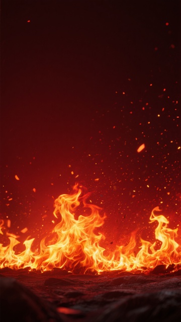深邃暗红色背景,大量留白,底部边缘燃烧着熊熊烈火,火焰呈现出明亮的橙红色和黄色,带有清晰的火焰纹理和动态燃烧感,火星和细小的火焰颗粒在空中飘散,营造出热烈、炽热且略带神秘的氛围,整体画面具有强烈的视觉冲击力和动态感。