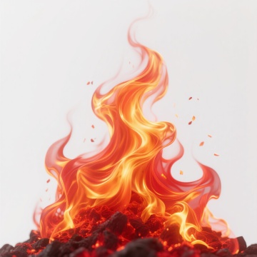 超写实火焰特写,以橙红与金黄为主色调,底部火焰呈现密集燃烧的炽热烈焰形态,向上逐渐过渡为灵动飘逸的火舌与轻盈的火星,火焰边缘带有明亮的高光与细腻的红色渐变,整体光影层次分明,具有强烈的立体感与动态燃烧的视觉冲击力,背景为纯白色,突出火焰的纯净与炽热,展现火焰从底部猛烈燃烧到上部轻盈舞动的变换造型,火焰纹理清晰可见,细节丰富,充满力量感与生命力。
