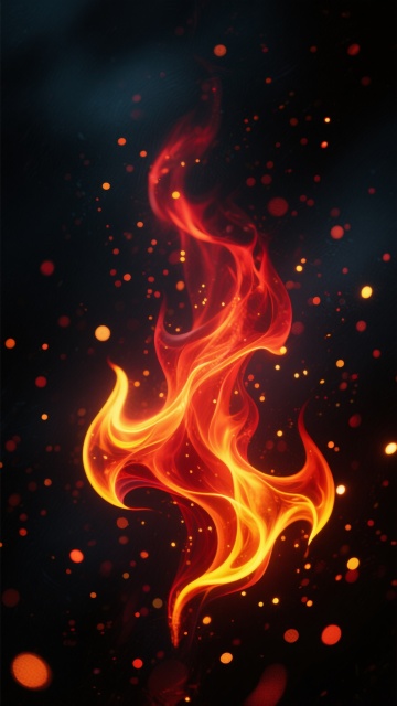 深色背景上,呈现出流动感强、形态抽象的火焰效果,火焰以红色和橙色为主色调,边缘带有明亮的黄色光晕,整体呈现出朦胧、飘逸的视觉效果。画面中布满了大小不一、疏密有致的火焰粒子和光斑,它们在深色背景上闪烁、飘散,营造出一种热烈而神秘的氛围。火焰的形态不具象,更像是流动的能量和燃烧的光影,充满了动感和层次感。