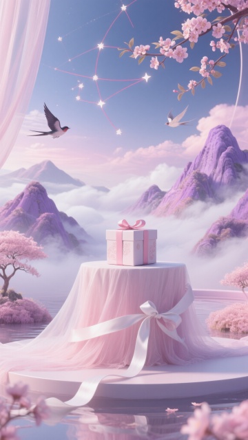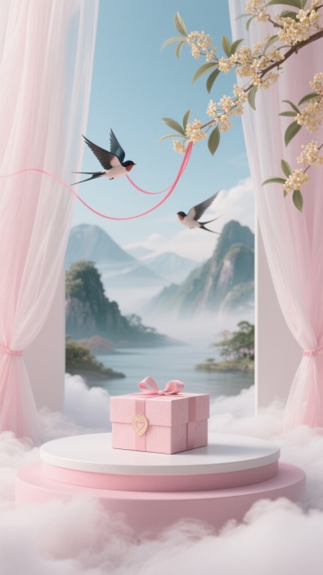 3D半写实粉白展台,轻纱山水背景,飞鸟衔红线绕桂花,七夕限定礼盒置于云雾台