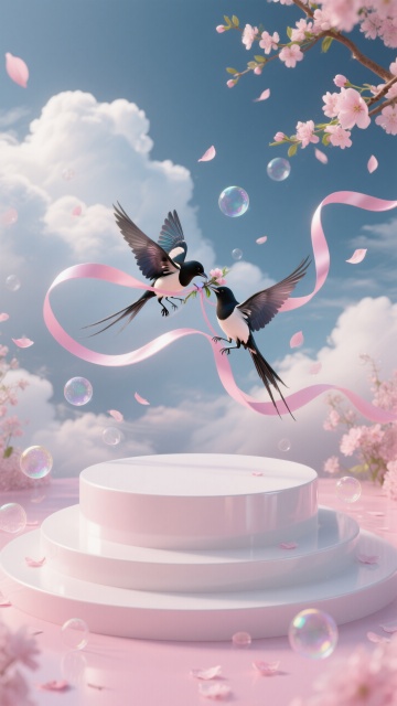 梦幻中式3D场景,浪漫樱花与飞鸟,超现实七夕节日氛围。