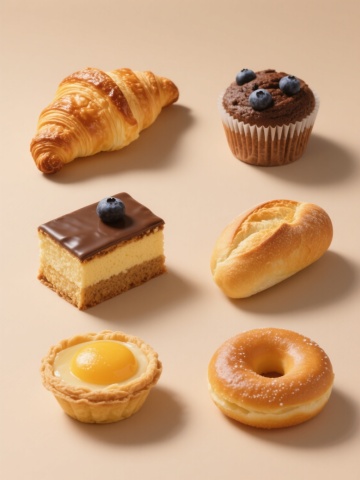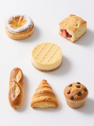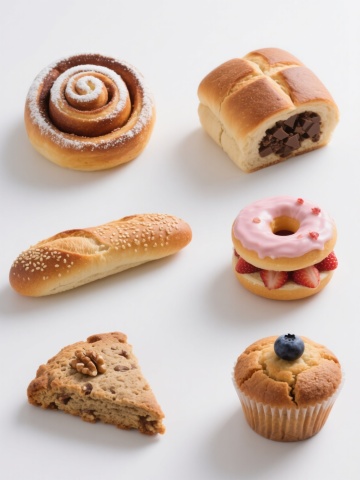 纯白纯色背景,保持超写实食物摄影风格,高分辨率,极致清晰的细节表现,柔和自然的顶侧光照射,呈现出面包表面金黄至深棕的渐变色泽与丰富的层次感,突出食物的质感与新鲜感。画面中规整排布6个完全不同的烘焙面包元素:第一个是表面撒有白色糖粉的圆形丹麦肉桂卷,螺旋状层次分明;第二个是顶部带有十字切口、内部夹有巧克力碎的方形巧克力餐包,表面呈均匀的浅棕色;第三个是长条形的芝麻法棍,表面布满细密的芝麻颗粒,有自然的烘焙裂纹;第四个是双层夹心的草莓酱甜甜圈,表面淋有半透明的粉色糖霜,点缀着细小的草莓碎;第五个是呈三角形的全麦核桃司康,表面有明显的核桃颗粒,色泽偏深;第六个是顶部放有一颗完整蓝莓的圆形蓝莓麦芬蛋糕,表面有烘焙形成的自然鼓包和裂纹。所有面包元素大小相近,以两行三列的整齐网格状布局排列,每个面包之间保持均匀间距,整体画面简洁干净,突出各类面包的独特形态、纹理和色泽,具有强烈的视觉吸引力和食欲感,适合作为烘焙产品系列素材集合。