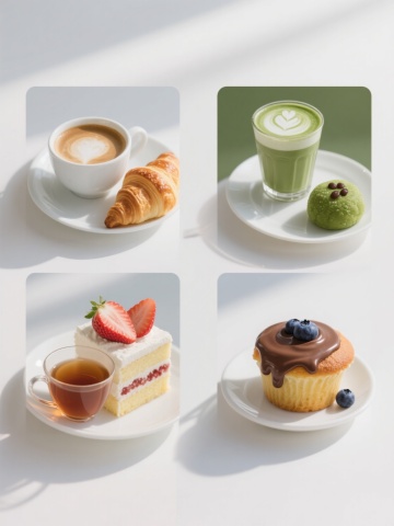 纯白背景上,四个不同下午茶甜点以等距九宫格式规整排列,保持高清写实摄影风格,光线明亮柔和,阴影细腻自然。左上角为抹茶红豆卷配银色小勺和薄荷叶,右上角是蓝莓芝士挞搭配金色小叉和新鲜蓝莓串,左下角呈现焦糖布丁配肉桂棒和香草豆荚,右下角展示草莓奶油马芬配覆盆子和白色陶瓷小碟,所有甜点色彩饱和,质感细腻,边缘清晰,整体构图平衡对称,营造出精致统一的下午茶系列感。