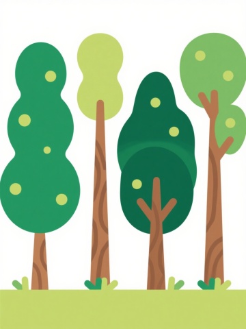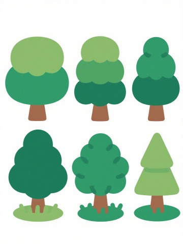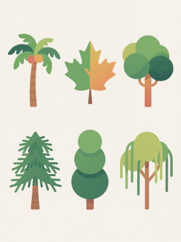 一组6个不同树木的扁平化插画,保持与原椰树一致的卡通风格,包括简洁的线条、圆润的形状和明亮的色彩。树木种类分别为:杨树、樟树、枫树、松树、柏树和柳树。每棵树都有独特的特征:杨树高大笔直,樟树有浓密的绿叶,枫树有五角形叶片,松树有针状叶,柏树呈圆锥形,柳树有下垂的枝条。所有树木排列整齐,背景为纯色(非白色,与原风格协调的单一色调),整体色彩进行变换但保持明快和谐的视觉效果,树木的色彩细节丰富,有渐变和阴影处理,展现出统一的设计感和识别度。