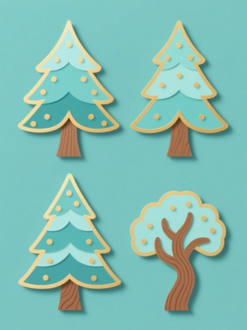 卡通风格圣诞节插画,四棵排列整齐的圣诞树,每棵圣诞树拥有不同的装饰、配色和外观,白色背景,整体艺术风格为平面插画,色彩鲜明活泼,主色调为绿色搭配多彩装饰色,光影表现为明亮均匀的正面光,无明显阴影,笔触质感平滑圆润,线条简洁流畅,构图为横向整齐排列,每棵圣诞树造型独特,分别装饰有不同颜色和样式的彩球、花环、铃铛、星星等饰品,树下摆放着与各自圣诞树配色协调的礼物盒,整体氛围欢快喜庆,充满节日气息,图像边缘清晰,无背景干扰,细节丰富且可爱。