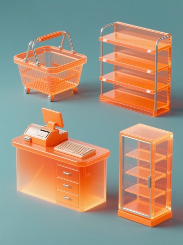 4个不同商城元素的集合,规整排布,每个元素都采用半透明渐变橙色塑料材质,带有金属光泽的细节,高光和阴影表现清晰,具有圆润的边角和可爱的造型,纯色背景,第一个是橙色购物车,第二个是橙色购物袋,第三个是橙色礼盒,第四个是橙色货架,整体风格统一,色彩和谐,适合作为商城系列素材