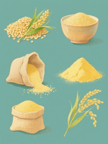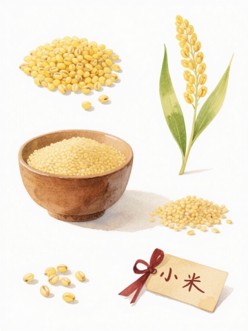 一幅水彩风格的小米系列素材集合,画面以纯净的白色为背景,整体色调温暖明快,以明亮的黄色系为主,搭配自然的绿色和质朴的棕色。画面中包含六个完全不同的小米元素内容,它们被规整地排布:左上角是一小堆圆润饱满的黄色小米颗粒,几颗散落在旁边;右上角是一株带有两片细长绿叶的小米穗,穗上结满了金黄的小米果实;左下角是一个棕色的粗陶碗,碗里盛满了蓬松的小米;中间偏下位置是一小撮摊开的小米;左下角偏右处是几颗散落的小米;右下角是一个用暗红色丝带系成的标签,上面用优雅的手写体写着“小米”。每个元素都保留了水彩特有的透明晕染质感和细腻的笔触,光影柔和,明暗过渡自然,营造出一种清新自然、质朴有机的氛围,整体构图平衡协调,信息传达清晰,具有很强的视觉吸引力和设计感,符合健康食品的宣传目的。