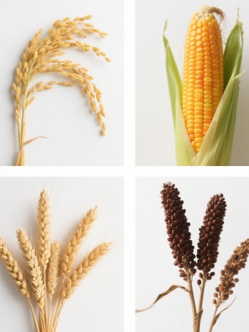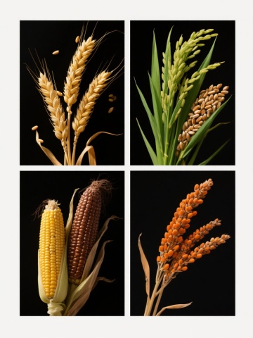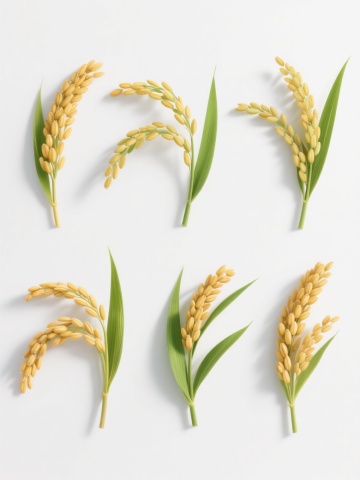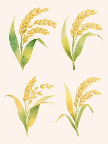 六张同系列素材集合,每张均为纯色背景,保持高清写实水彩风格,以稻穗为类目核心元素,第一张为饱满低垂的金黄色稻穗束,第二张为稻穗与饱满稻粒特写,第三张为稻穗与绿色稻叶交错,第四张为稻穗与稻穗茎秆组合,第五张为稻穗与稻穗局部细节,第六张为稻穗与稻穗整体形态,所有元素均采用规整排布,色彩以金黄色与绿色为主,光影柔和,细节丰富,具有清晰的视觉层级和信息传达效率,符合农业主题的设计感。