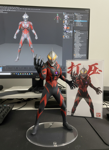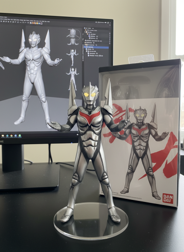 科技感十足的3D角色模型,金属风设计,未来感强烈,展示于现代办公环境。