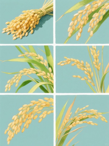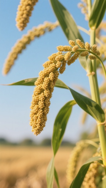 阳光下成熟饱满的小米谷穗特写,金黄颗粒与翠绿长叶相映,浅景深突出穗粒质感,自然柔和光线勾勒植物轮廓,田野背景虚化营造丰收氛围,展现小米作物的原生态生长状态