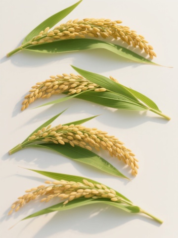 写实摄影风格的田野麦穗自然景观,画面上方50%为纯净的白色留白,下方前景中特写几支饱满成熟的金黄色麦穗,麦芒纤细清晰,麦粒纹理分明,呈现出自然的光泽与质感,背景虚化的麦穗形成渐变的浅金色层次,整体光影柔和,色调温暖,构图简洁大方,突出麦穗的自然形态与田野的宁静氛围。
