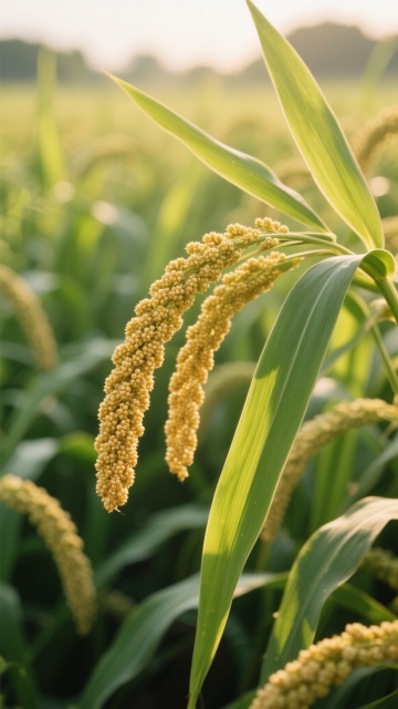 清晨阳光下的小米种植田,饱满金黄的小米穗低垂在翠绿修长的叶片间,近景特写小米颗粒的细腻质感,背景虚化的绿色禾苗形成自然景深,柔和的侧光勾勒出谷物的轮廓光,温暖的色调展现丰收的生机与自然纯粹之美,突出小米作物的原生态与营养价值。