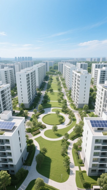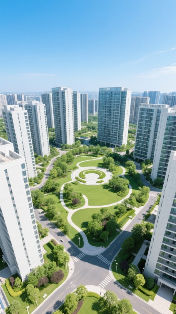 高角度航拍视角下的现代化工业园区背景,宽阔整洁的厂区道路两侧是修剪整齐的绿色灌木丛和高大乔木,排列有序的白色单层工业厂房带有蓝色边框和大面积玻璃窗,停车场内停放着多辆不同颜色的汽车,远处可见连绵的城市建筑群和被蓝天白云覆盖的晴朗天空,阳光明媚,光影清晰,整体呈现出干净、有序、充满活力的工业环境氛围。