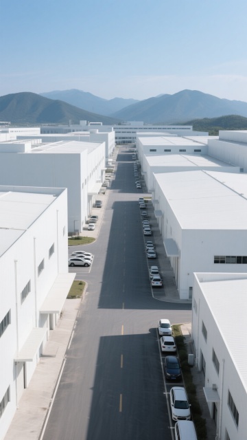 极简主义风格工厂全景,现代化白色厂房建筑群,开阔的厂区道路,整齐停放的车辆,远处山脉与蔚蓝天空相接,简洁利落的线条,大面积留白,低饱和度的蓝白灰主色调,柔和均匀的自然光,清晰的结构轮廓,几何感十足的建筑形态,干净的画面质感,展现工业设施的秩序与纯粹之美。