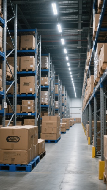 高写实主义摄影风格,现代物流仓库内部场景,不同样式的仓库布局设计,金属框架结构的高货架整齐排列,货架上堆满各种规格的棕色纸箱,部分纸箱印有不同品牌标识,地面为灰色水泥地,蓝色托盘承载货物,仓库顶部装有多排明亮的白色LED照明灯,光线均匀照亮整个空间,营造出高效、有序、专业的仓储氛围,画面具有清晰的纵深空间感,细节丰富,色彩以工业灰、金属蓝和纸箱棕为主色调,整体呈现出真实、严谨的纪实感。