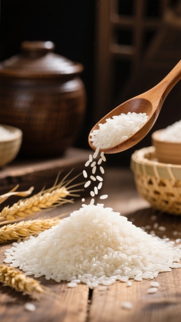 高清摄影风格,温暖柔和的自然光从侧上方照射,营造出温馨质朴的氛围,画面主体为一只木质舀米勺正倾斜着将饱满圆润的白色大米颗粒缓缓洒落,下方是堆积在木质桌面上的大量晶莹剔透的大米,旁边点缀着几支金黄的麦穗,背景为模糊的深色木质器物和编织篮,整体色调以米白、浅木色和暖黄色为主,光影层次分明,大米颗粒的质感细腻清晰,高光处反射出柔和光泽,阴影自然过渡,构图采用近景特写,突出大米的质感与动态洒落的瞬间,传递出自然、纯净、原生态的感觉。