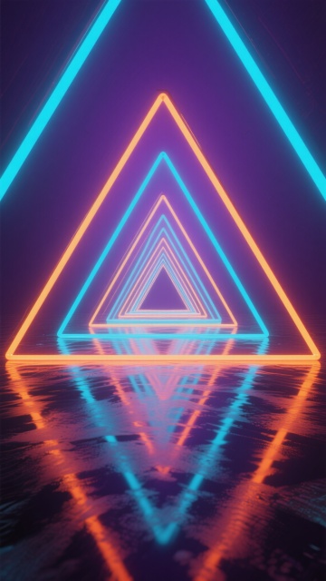 赛博朋克风格电竞背景,深邃暗蓝色与紫色渐变的未来科技感空间,中央是由多层发光三角形框架构成的隧道式结构,框架边缘发出明亮的蓝紫色霓虹光效,底部为反光金属质感的紫色地面,地面上有平行的发光线条延伸至远方,正前方有一个圆形的黑色平台,平台边缘环绕着蓝紫色霓虹灯圈,整体画面充满动感与科技氛围,光影对比强烈,具有强烈的视觉冲击力和空间纵深感。