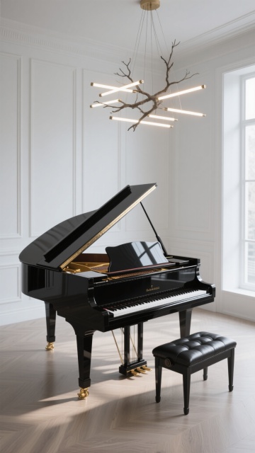 从钢琴侧面偏上方俯视角拍摄的特写画面,深色木质三角钢琴的琴键与琴身细节清晰可见,一双穿着深色西装的手正优雅地弹奏黑白琴键,手指关节与指尖的动作富有韵律感。画面整体采用暗调写实风格,顶部斜射而下的金色光束穿透空气中的微尘,在琴键和手背上形成强烈的明暗对比与细腻光斑,背景深黑模糊以突出主体。光线营造出静谧而神圣的氛围,钢琴的木质纹理与琴键的光泽质感真实可触,整体构图聚焦手部与琴键的互动,传达出古典音乐的优雅与沉浸感。