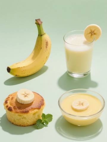 超写实摄影风格的香蕉类食物集合海报,高分辨率,纯白纯色背景,明亮均匀的无影光源,柔和自然的阴影。画面中整齐排列四种食物:一串新鲜饱满的黄色香蕉,香蕉表皮带有自然的褐色小斑点,顶部连着绿色的蕉蒂;一杯装在透明玻璃杯中的香蕉牛奶饮品,奶液呈现顺滑的淡黄色,表面漂浮着一片完整的香蕉切片;几块金黄色的香蕉松饼,表面微微隆起,带有烤制的焦糖色边缘,顶部各放置一片香蕉片;一碗细腻柔滑的香蕉布丁,呈诱人的淡黄色,质地Q弹,表面同样点缀着一片香蕉。每种食物上都有一片香蕉点缀,所有香蕉元素的纹理细节清晰可见,如香蕉果肉的细腻纹路和黑色小点。整体色调为清新的淡绿色系,从浅绿色背景到深绿色食物细节(如蕉蒂、装饰性绿叶元素),色彩和谐统一,突出食物的新鲜感和食欲感。视觉层级清晰,主体食物作为最重要的信息通过大小和位置被突出,整体设计简洁高效,能在短时间内清晰传达核心信息,符合追求健康、美味的受众审美和食品宣传目的,具有强烈的设计感和吸引力。