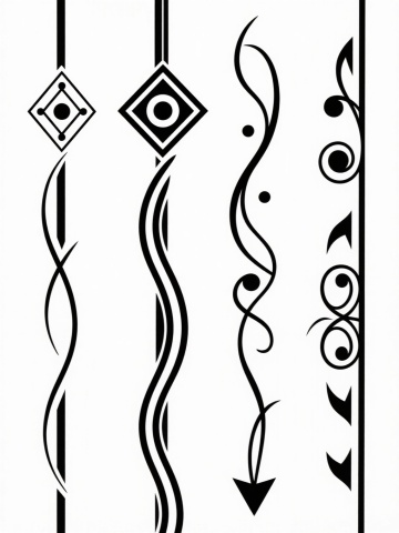 极简风格黑白装饰分割线系列素材集合,纯白纯色背景,4个完全不同造型的同元素内容垂直排布,每个分割线均由对称的几何图形与流畅曲线组合构成,包含圆点、线条等装饰元素,线条粗细均匀,边缘清晰锐利,间距相等,整体呈现简洁、专业、具有设计感的视觉效果,适合用于排版分隔、页面装饰或内容区隔。