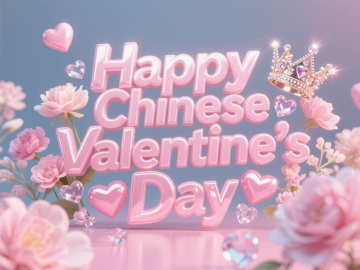 "七夕情人节快乐”3D英文大字,鲜花爱心皇冠装饰,粉嫩