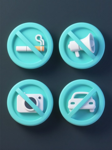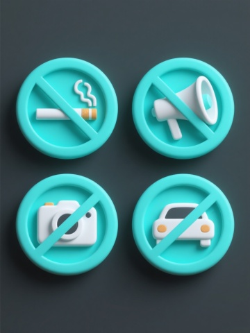 四个呈规整网格排布的软3D风格图标集合,整体采用明亮的蓝绿色调渐变,每个图标均为纯色背景。每个图标都包含一个圆形边框,内部有一个斜向的禁止符号。第一个图标是禁止吸烟,圆形内有一个3D风格的香烟图案,被斜杠穿过;第二个图标是禁止喇叭,圆形内有一个3D风格的喇叭图案,被斜杠穿过;第三个图标是禁止拍摄,圆形内有一个3D风格的相机图案,被斜杠穿过;第四个图标是禁止开车,圆形内有一个3D风格的汽车图案,被斜杠穿过。所有图标都具有柔和的阴影和高光,呈现出轻微的立体感,整体设计简洁明了,具有现代感和设计感。