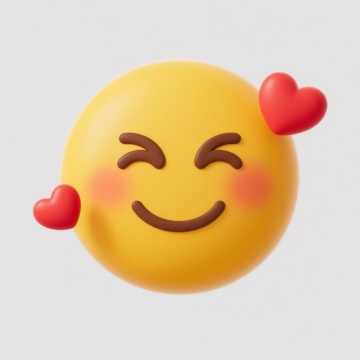 一个黄色圆形笑脸emoji,眉毛呈弯曲的棕色弧线,双眼眯成两条棕色弯线,脸颊有淡淡的橙红色腮红,嘴巴是向上弯曲的棕色微笑弧线,左右两侧和右上方各有一个红色爱心,所有元素均为平滑圆润的卡通风格,边缘清晰无锯齿,整体色彩鲜明饱和,背景为纯白色纯色背景。