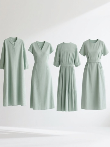 六款不同剪裁风格的连衣裙系列素材集合,规整排布在纯色背景上,保持原图的3D渲染风格、平滑的布料质感、清晰的光影过渡和简洁的构图,整体变换色彩,每款连衣裙的剪裁设计完全不同,包括但不限于A字裙、直筒裙、伞裙、修身裙、吊带裙、衬衫裙等,保持相同的布料质感和光影表现,确保整体视觉风格统一且系列感强,信息传达清晰,设计感符合服装展示的目标受众和审美需求。