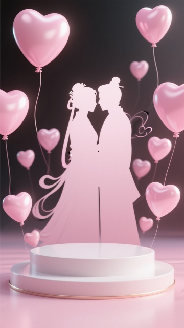 前面有一个梦幻粉白色圆形展台,展台背景是一对情侣正相拥穿着古装剪影。周围漂浮着多个粉色的气球和心形图案,整体色调以粉色为主,营造出充满爱意的氛围