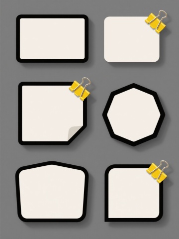 一系列6个完全不同形状的文本框素材集合,每个文本框均为简约扁平设计风格,无任何文字内容,保持纯色背景,规整排布。每个文本框右上角配有一个黄色金属质感的回形针夹,夹子具有轻微的高光和阴影细节,文本框边缘有细微的黑色描边和底部投影,呈现出简洁而略带立体感的视觉效果,整体设计统一且每个文本框形态各异。